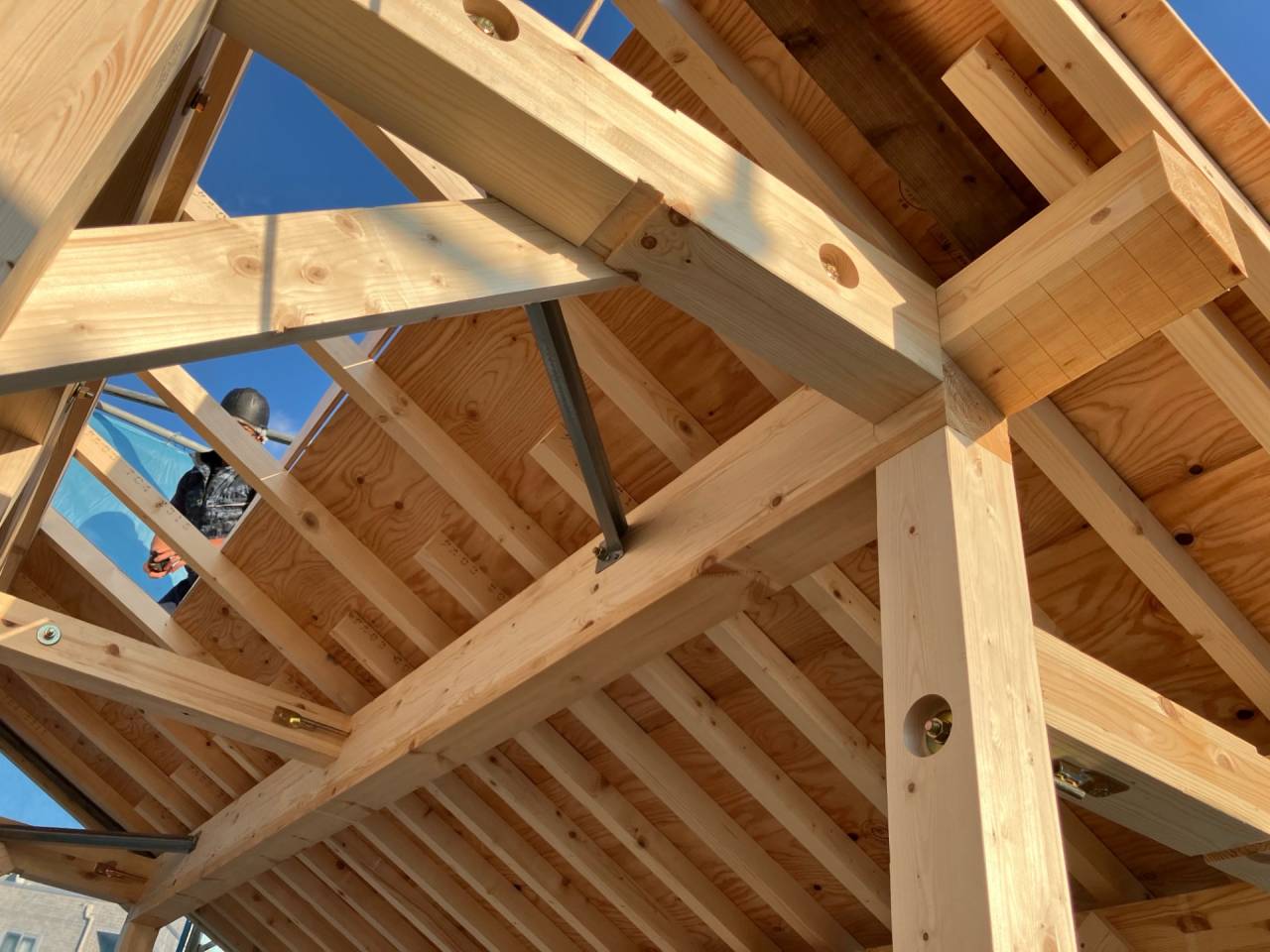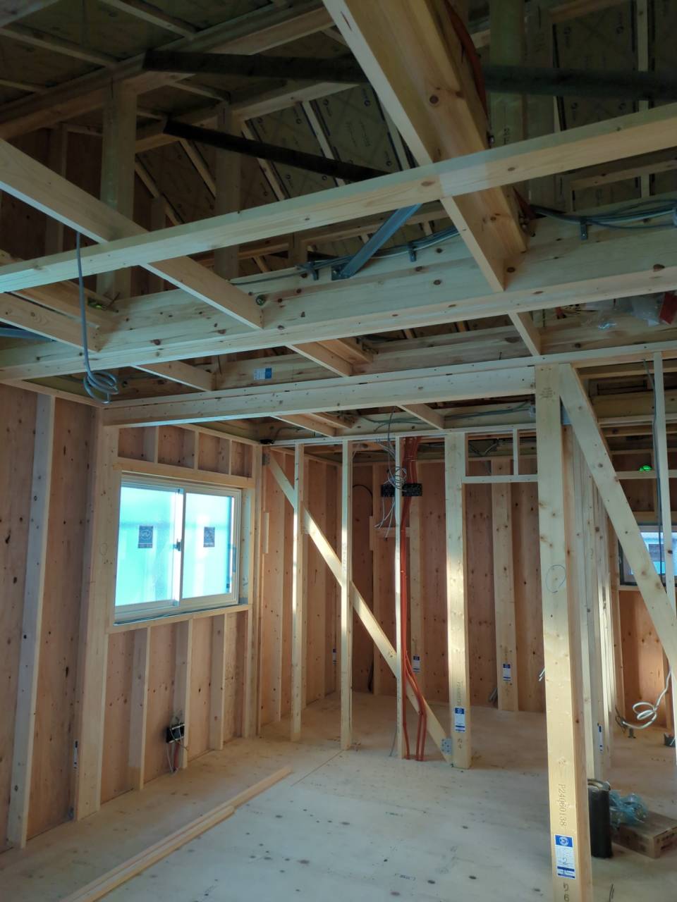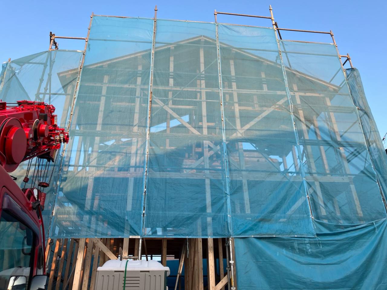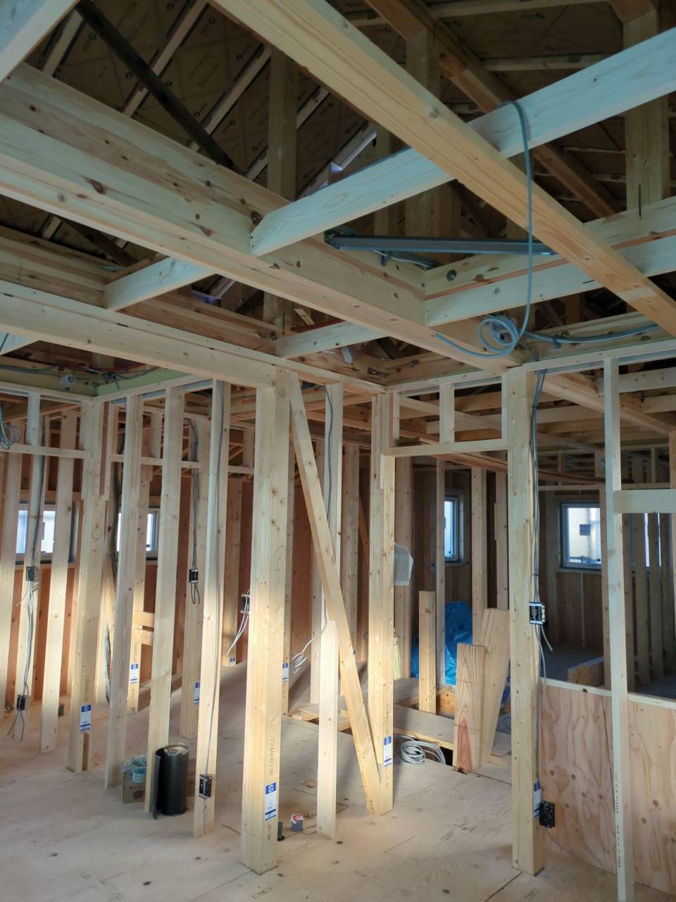 Y様N様邸新築工事 2024/12/13 内装工事も完了しました。 本日社内検査を実施しました。 内部をじっくりとご覧ください。 二世帯住宅のとても大きな家が完成しました。 2階へ移動します。 足場が外れました。 内装の下地処理がもうすぐ終わります。 外壁の防水シートが貼り終えました。 内装の下地ボードを貼る準備ができました。 外装材を貼る準備も完了です。 内壁に断熱材が吹き付けられました。 屋根裏にもきっちりと断熱工事がなされています。 構造ご覧いただきましょう。 ダクトの中をご覧いただくことは余り無いのでは? ベランダの防水処理も完璧です。 外壁合板が貼り終えました。 建具を入れるために、高窓や小窓の外壁の合板は切除されます。 建具が入るのを待っています。 屋根が葺き上がりました。 構造をご覧ください。 金具を使って十分な補強を行っています。 上棟しました。 大勢の大工さんが協力して立ち上げます。 今は重機が大活躍です。 狭いところで、芸術的な動きです。 子供でなくても、一日見ていて飽きません。 配筋工事も完了です。 地盤改良工事完了。 地鎮祭を執り行いました。 新築住宅