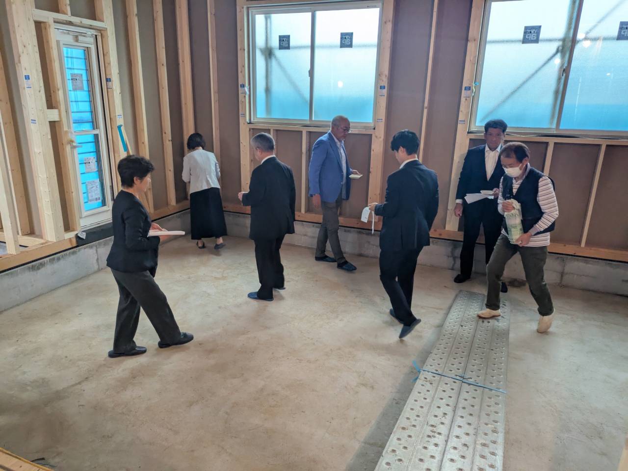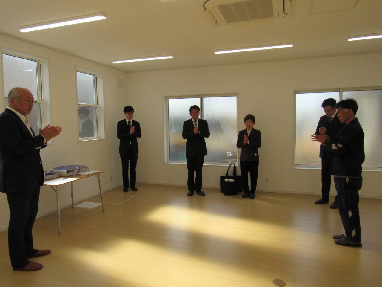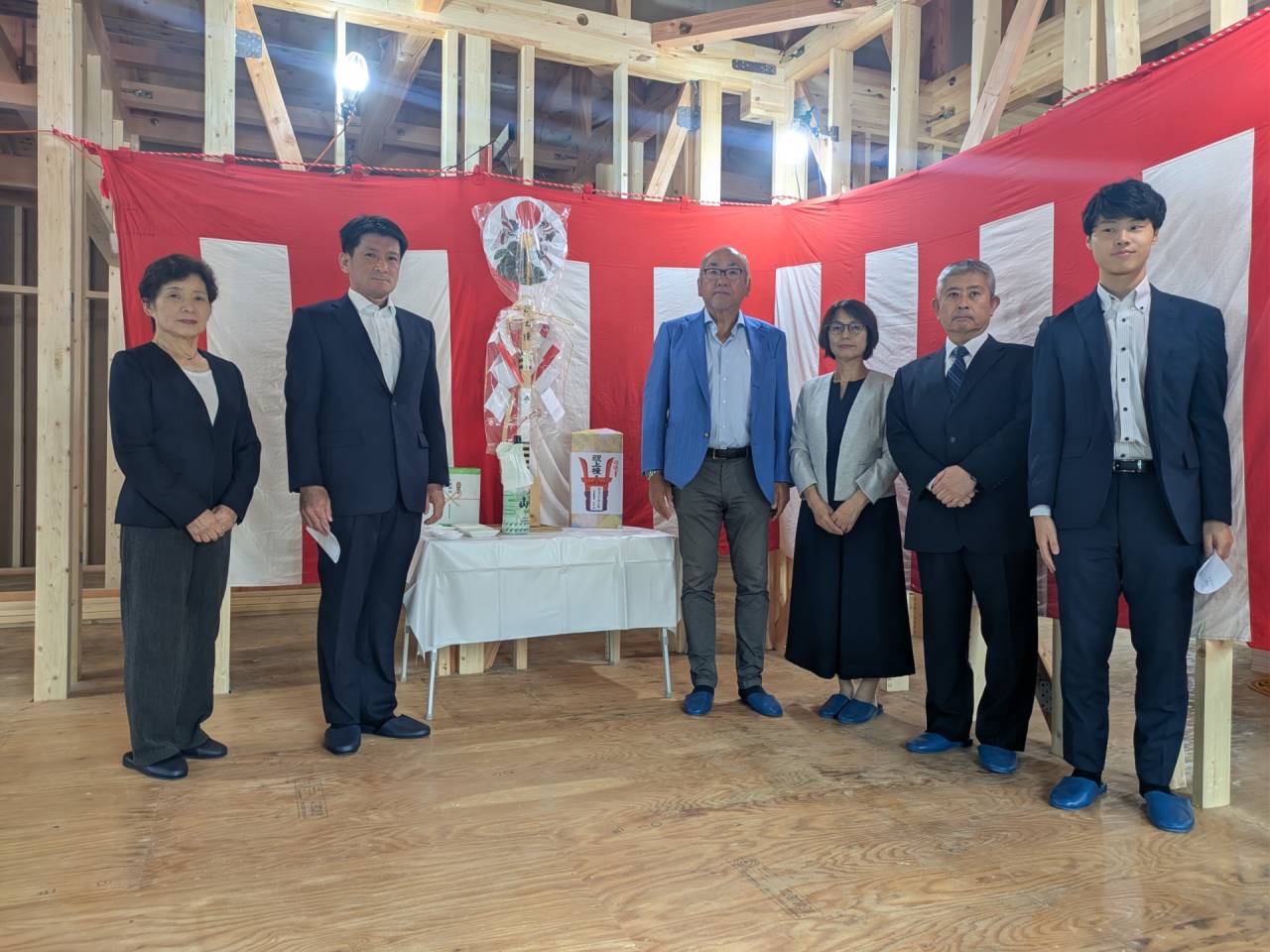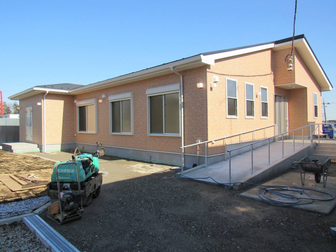 スマイルファクトリー新築工事 2026/01/30 竣工致しました。 外観をごらんいただきましょう。 内部もご覧ください。 お引渡しの式が執り行われました。 弊社からお施主様へお引渡しをさせて頂きました。 お施主様から運営法人様にお引渡して頂きました。 外構工事が終わればお引渡しです。 木工事が終わりました。 外壁工事もほぼ完了です。 外壁に防水シートを貼り終えました。 内部の断熱工事始まりました。 サッシが入り、外壁の下地が貼られました。 内部の構造をご覧ください。 屋根の垂木まで組み上がりました。 野地板が貼り終えました。 上棟式が行われました。 棟梁が先導して四方を清めました。 上棟しました。 内部の構造をご覧ください。 ルフィングシートが丁寧に貼られています。 野地板もしっかりと貼り終えました。 垂木がしっかりと貼られています。 上棟が始まりました。 床下の断熱と床の下地を貼って、いよいよ上棟です。 木工事が始まりました。 木工事が始まりました。 基礎工事が完了しました。 基礎工事が始まりました。 造成工事が始まりました。 境界のブロック工事が始まりました。 福祉施設・店舗建築