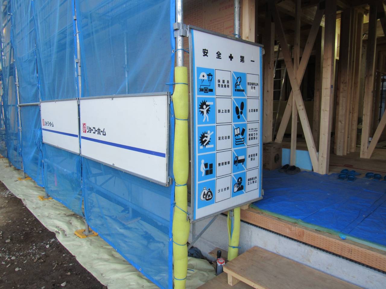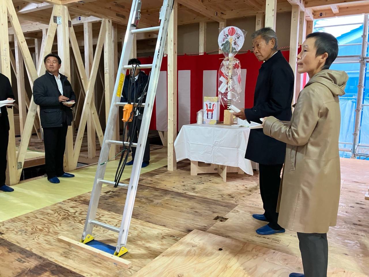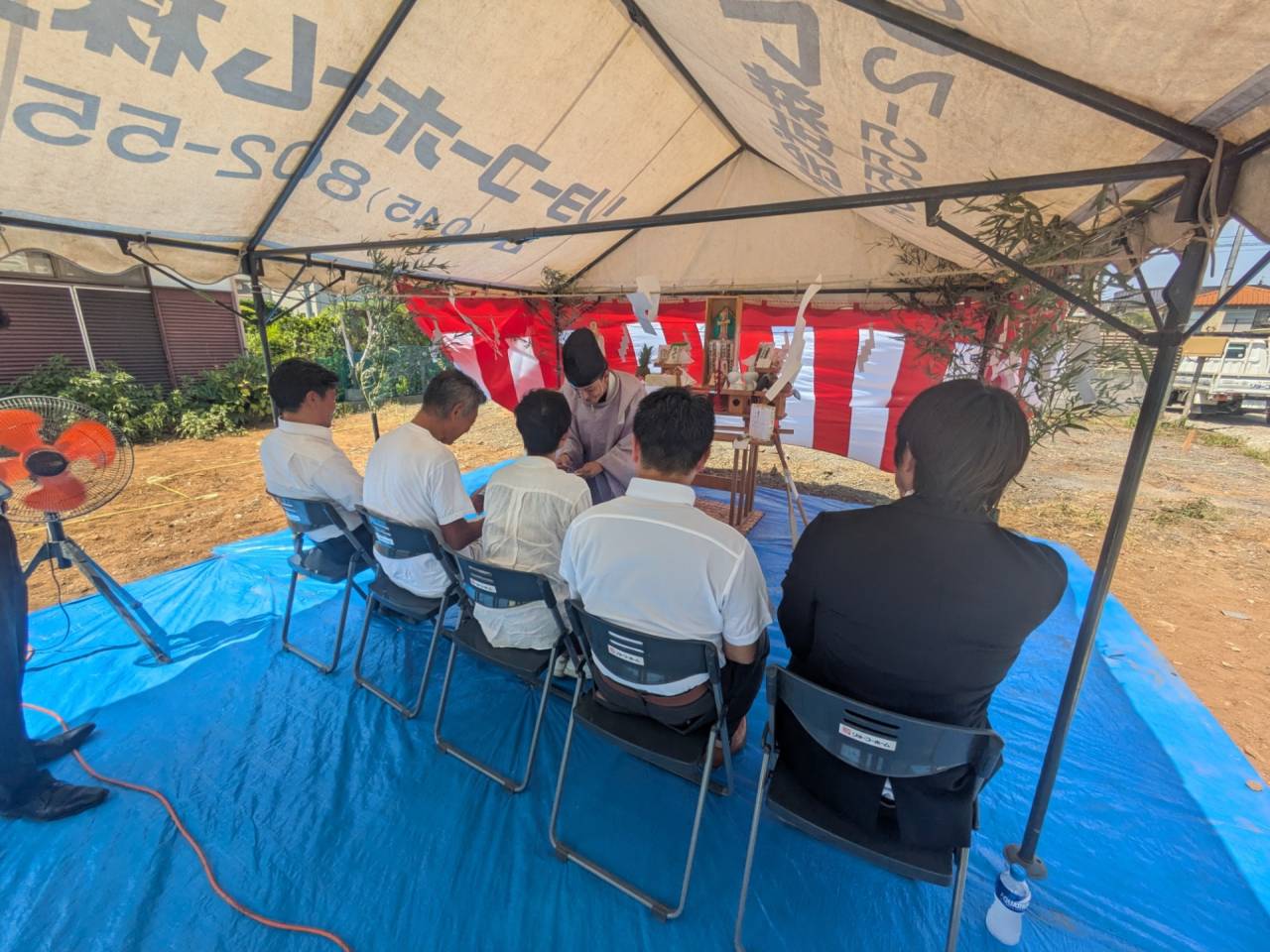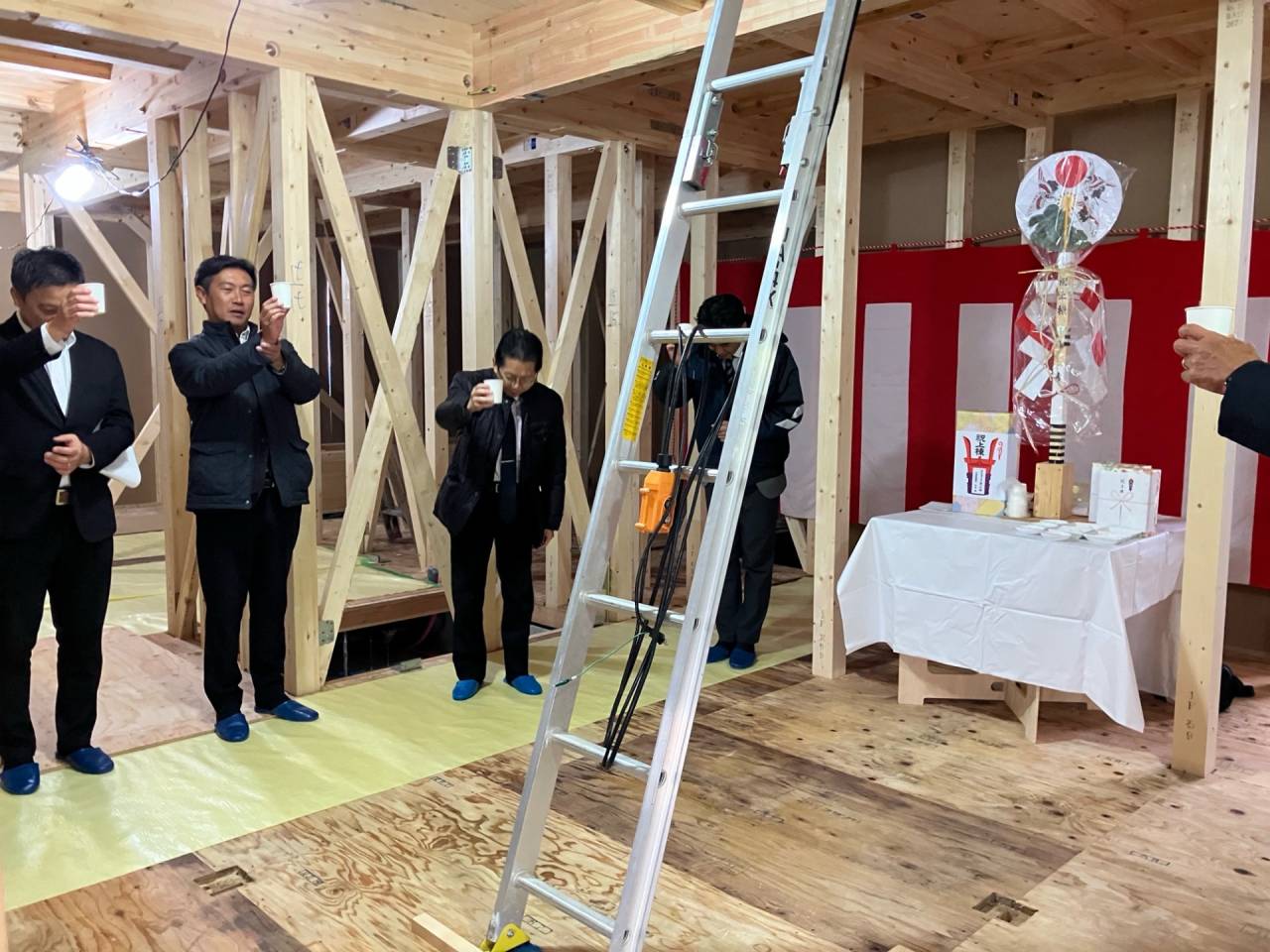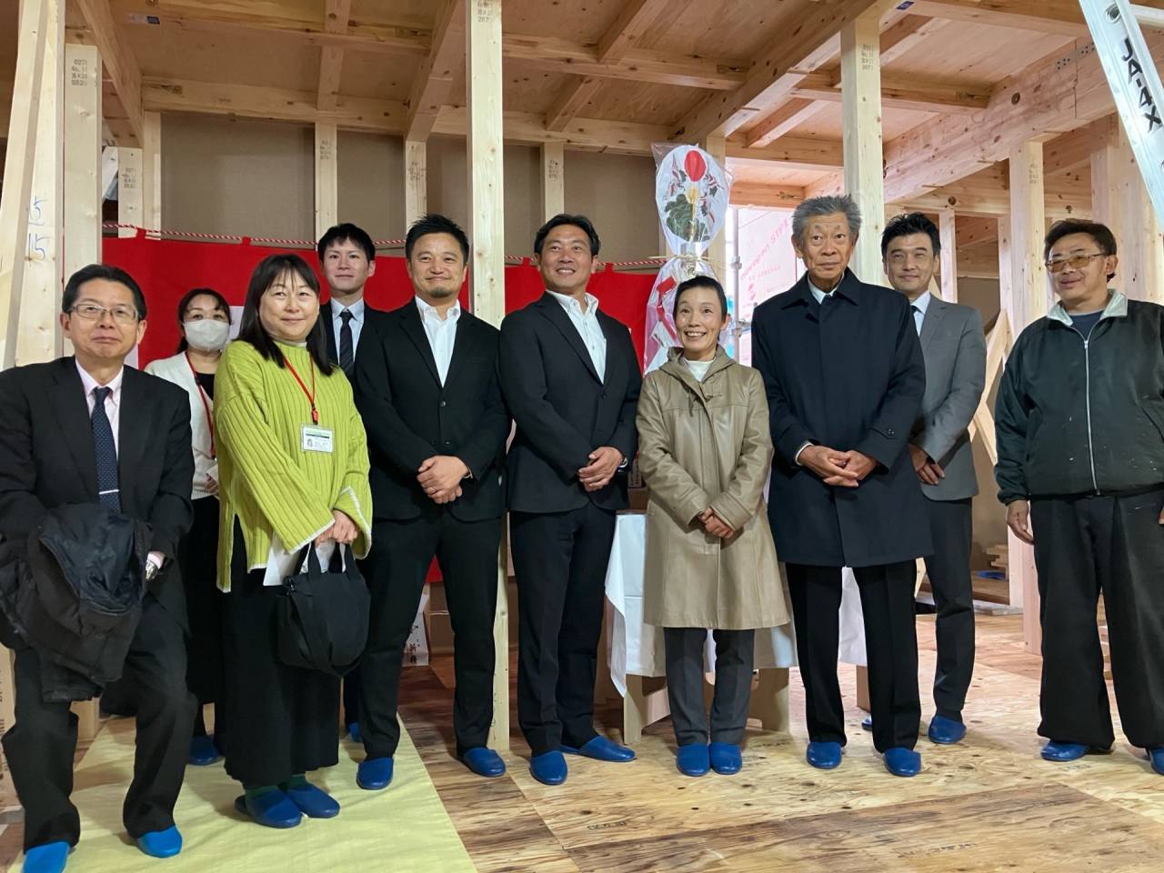 みなみ風15新築工事 2026/03/06 残念ですが、外構工事中で内部をお見せ出来ません。 次回をお楽しみに。 外壁の工事もほぼ終わりました。 木工事も大分進んでいます。 断熱工事が完了しました。 建物の全容が分かるようになりました。 安全第一に工事を進めています。 中央にある飾りは幣串(へいぐし)と言い、新築の棟上げの儀式で、家屋の守護と家内安全を願って屋根裏の最も高い部分(棟木)に取り付けられる魔除けの飾りです。 構造をご覧ください。金具による補強もしています。 屋根の防水工事が終わりました。 上棟式を行いました。 建物の4隅を清めました。 完成の無事を祈って乾杯をしました。 関係者がそろって記念撮影です。 上棟しました。 野地板を貼り終えました。 垂木も貼り終えました。 木工事が始まりました。 基礎工事が終了しました。 基礎工事が始まりました。 配筋工事が終了しました。 地鎮祭が行われました。 神主様により四方を清めました。 鍬入れの儀です。 関係者全員がお祓いをして頂きました。 お神酒でお清めをしました。 地鎮祭も無事終わり、記念撮影です。 福祉施設・店舗建築