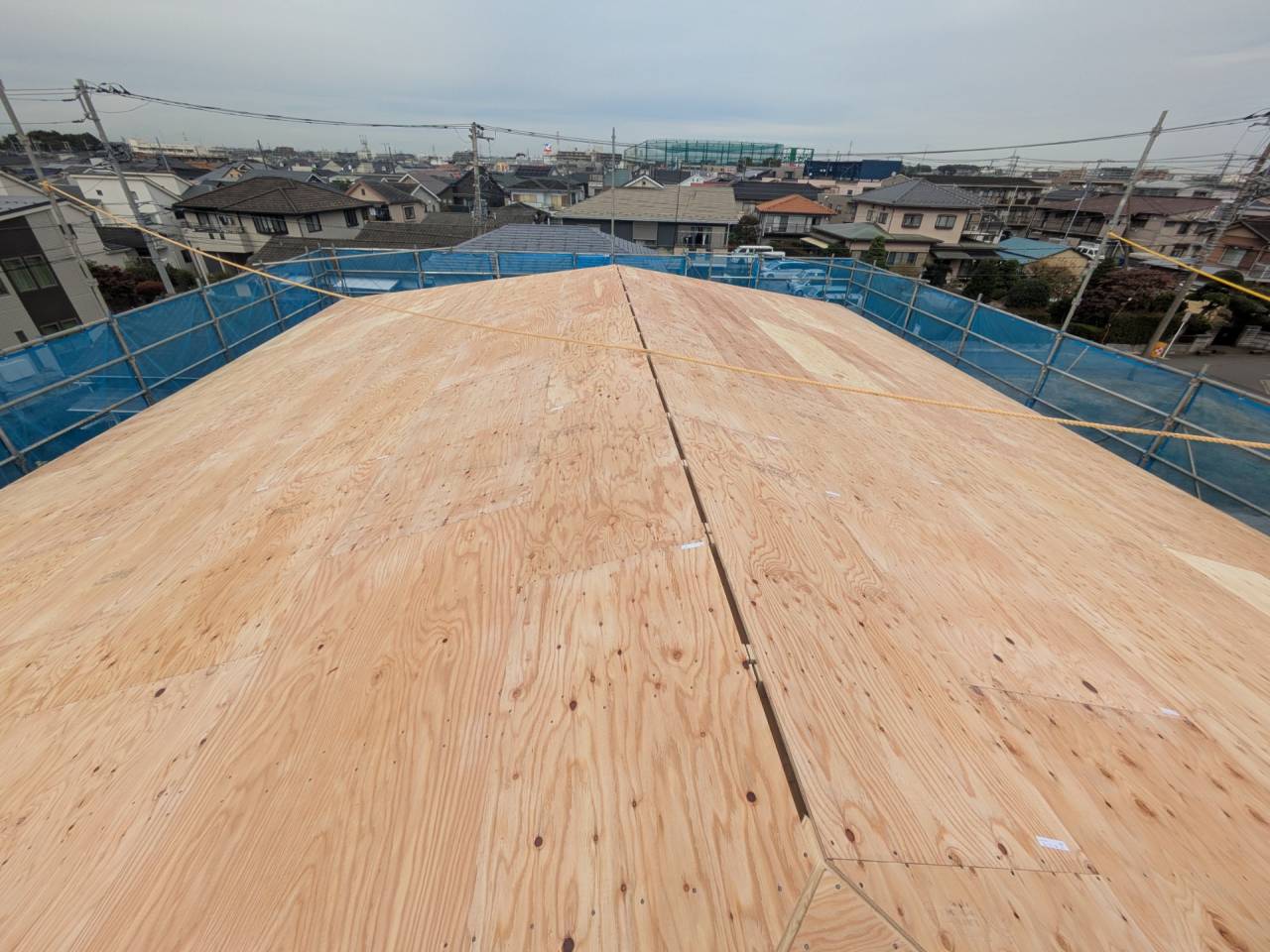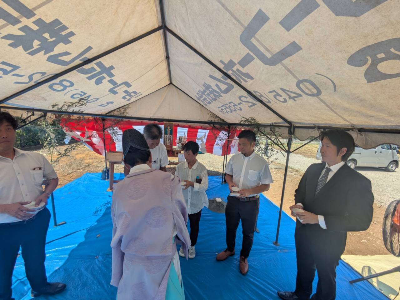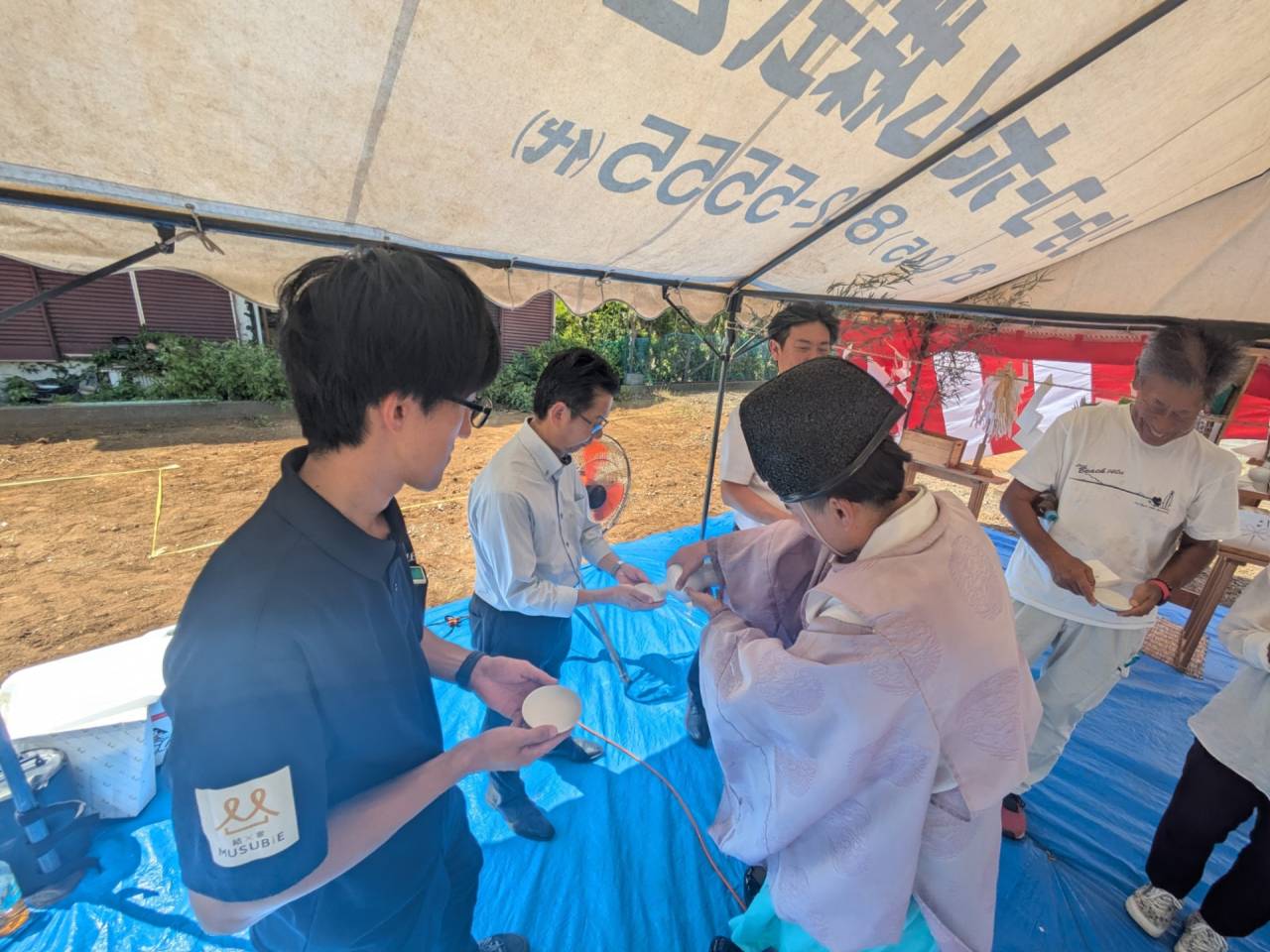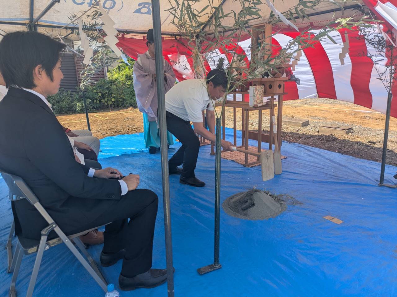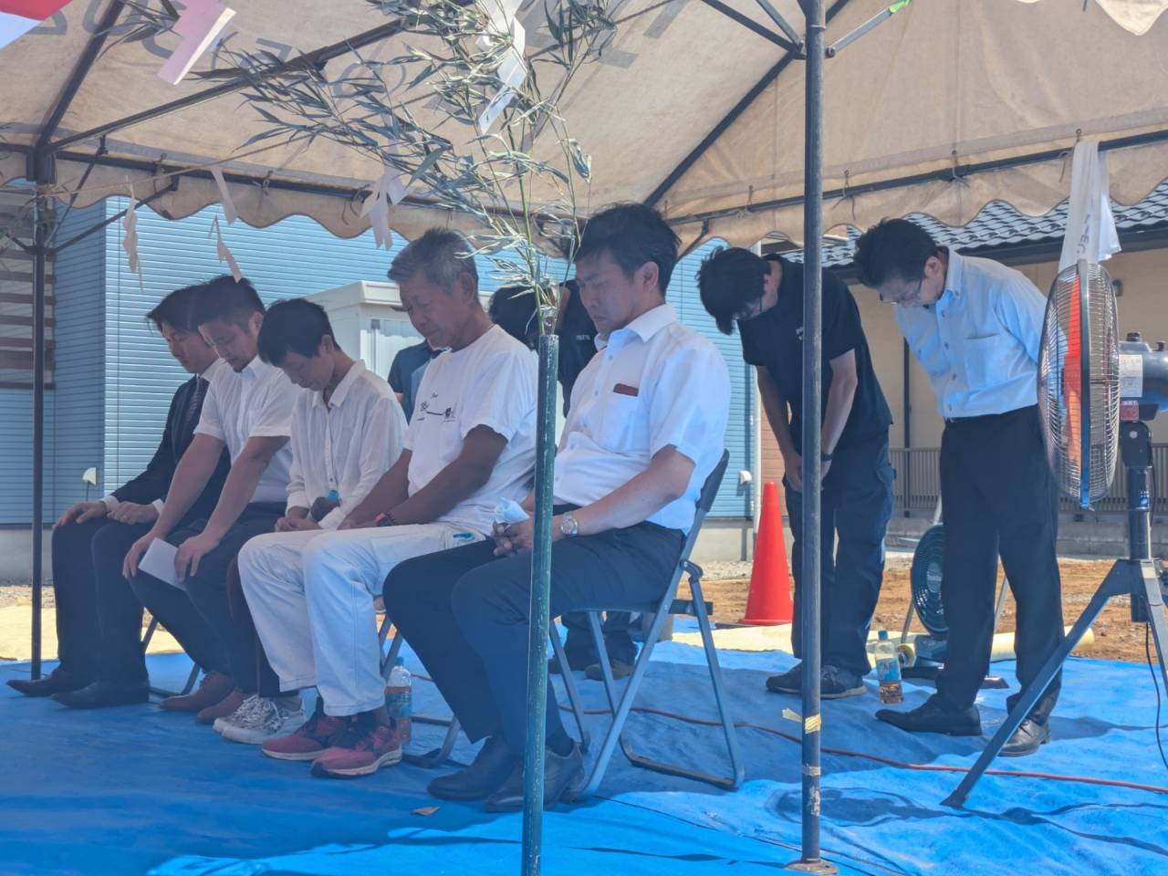 みなみ風15新築工事 2026/03/06 残念ですが、外構工事中で内部をお見せ出来ません。 次回をお楽しみに。 外壁の工事もほぼ終わりました。 木工事も大分進んでいます。 断熱工事が完了しました。 建物の全容が分かるようになりました。 安全第一に工事を進めています。 中央にある飾りは幣串(へいぐし)と言い、新築の棟上げの儀式で、家屋の守護と家内安全を願って屋根裏の最も高い部分(棟木)に取り付けられる魔除けの飾りです。 構造をご覧ください。金具による補強もしています。 屋根の防水工事が終わりました。 上棟式を行いました。 建物の4隅を清めました。 完成の無事を祈って乾杯をしました。 関係者がそろって記念撮影です。 上棟しました。 野地板を貼り終えました。 垂木も貼り終えました。 木工事が始まりました。 基礎工事が終了しました。 基礎工事が始まりました。 配筋工事が終了しました。 地鎮祭が行われました。 神主様により四方を清めました。 鍬入れの儀です。 関係者全員がお祓いをして頂きました。 お神酒でお清めをしました。 地鎮祭も無事終わり、記念撮影です。 福祉施設・店舗建築