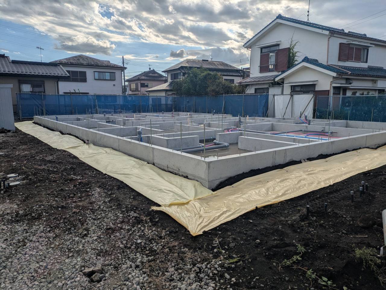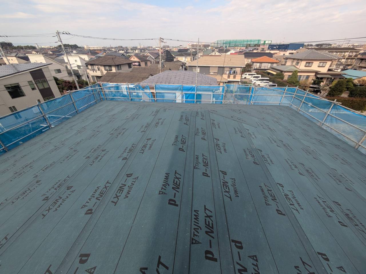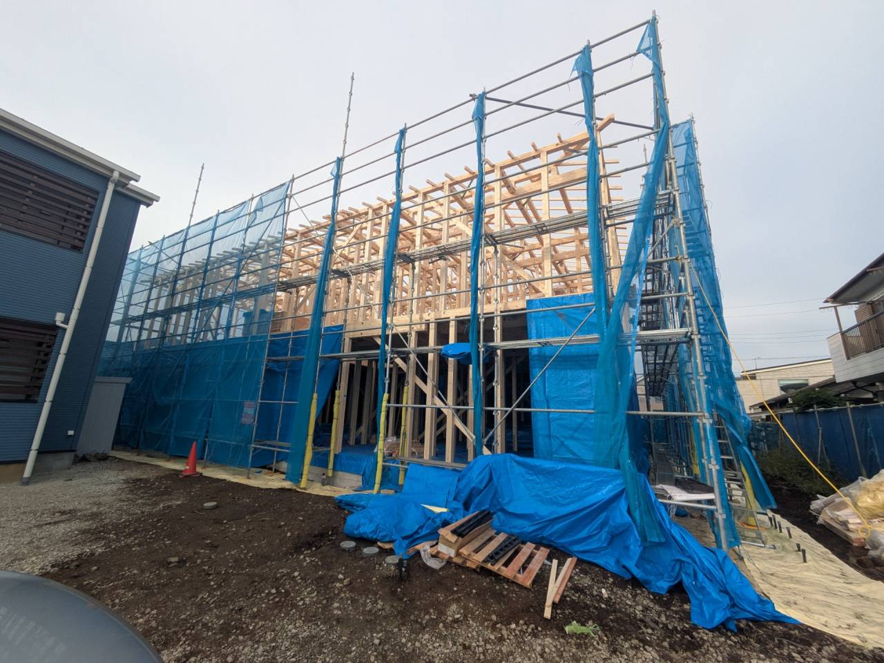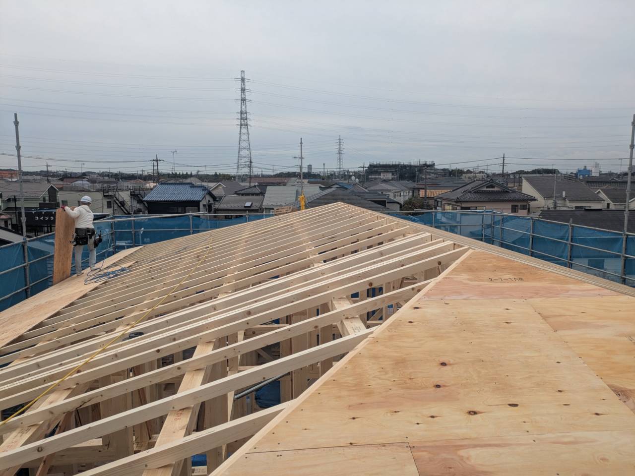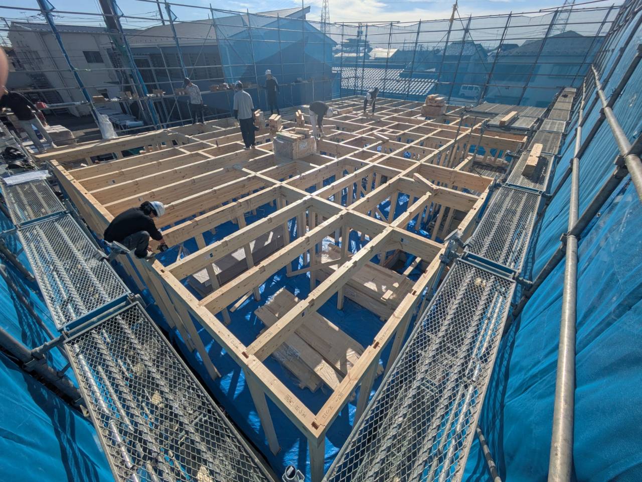 みなみ風15新築工事 2026/03/06 残念ですが、外構工事中で内部をお見せ出来ません。 次回をお楽しみに。 外壁の工事もほぼ終わりました。 木工事も大分進んでいます。 断熱工事が完了しました。 建物の全容が分かるようになりました。 安全第一に工事を進めています。 中央にある飾りは幣串(へいぐし)と言い、新築の棟上げの儀式で、家屋の守護と家内安全を願って屋根裏の最も高い部分(棟木)に取り付けられる魔除けの飾りです。 構造をご覧ください。金具による補強もしています。 屋根の防水工事が終わりました。 上棟式を行いました。 建物の4隅を清めました。 完成の無事を祈って乾杯をしました。 関係者がそろって記念撮影です。 上棟しました。 野地板を貼り終えました。 垂木も貼り終えました。 木工事が始まりました。 基礎工事が終了しました。 基礎工事が始まりました。 配筋工事が終了しました。 地鎮祭が行われました。 神主様により四方を清めました。 鍬入れの儀です。 関係者全員がお祓いをして頂きました。 お神酒でお清めをしました。 地鎮祭も無事終わり、記念撮影です。 福祉施設・店舗建築