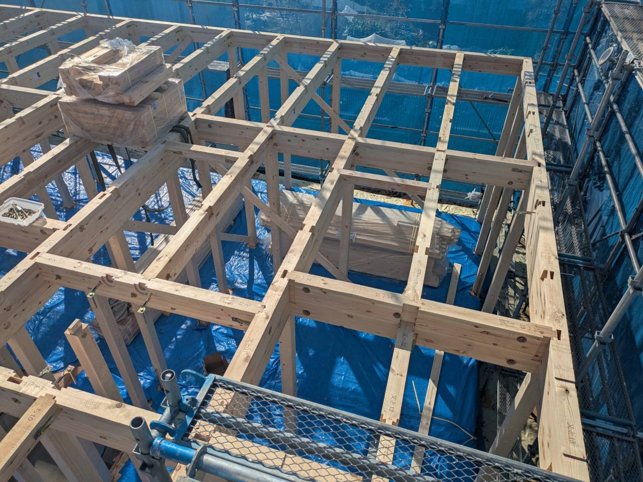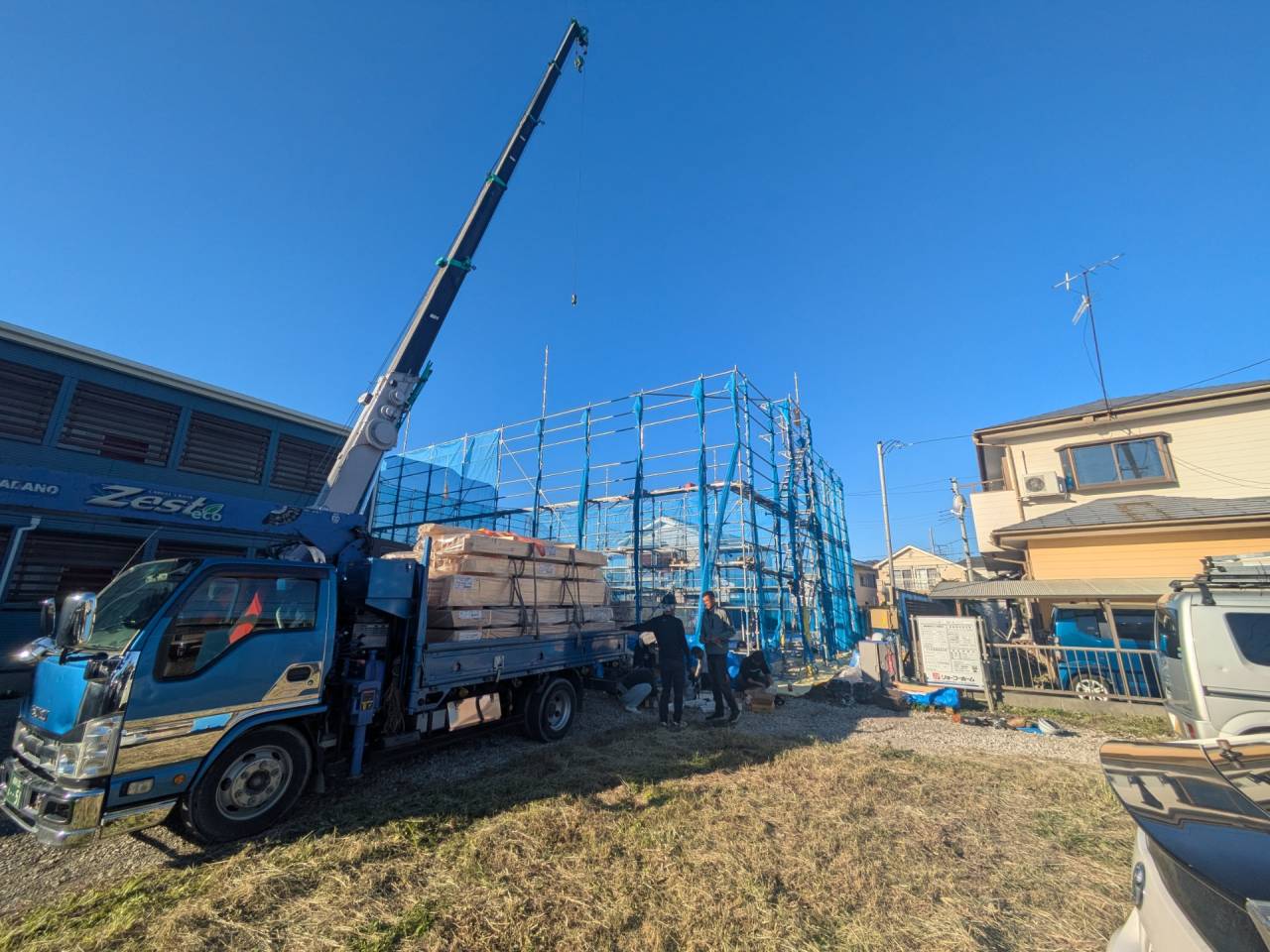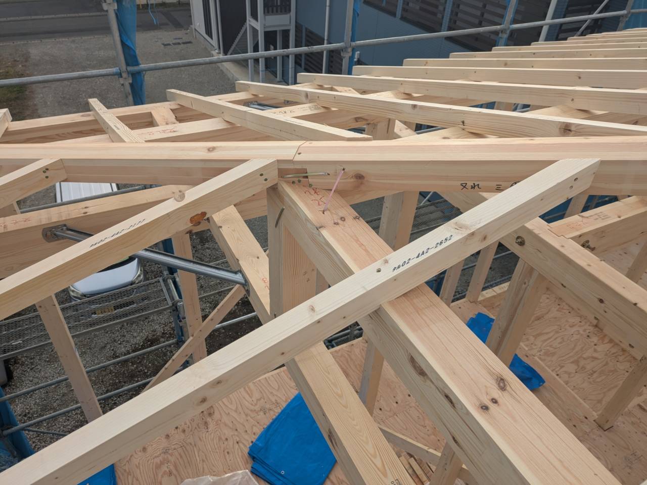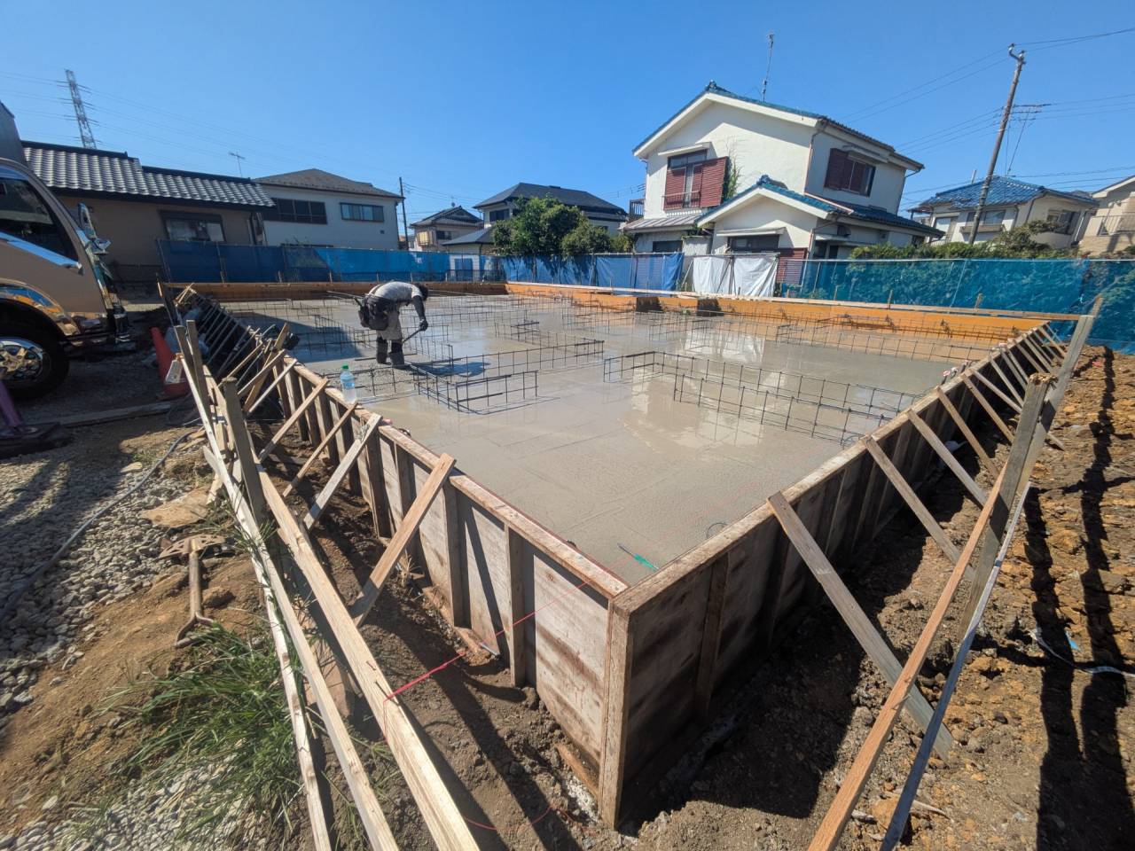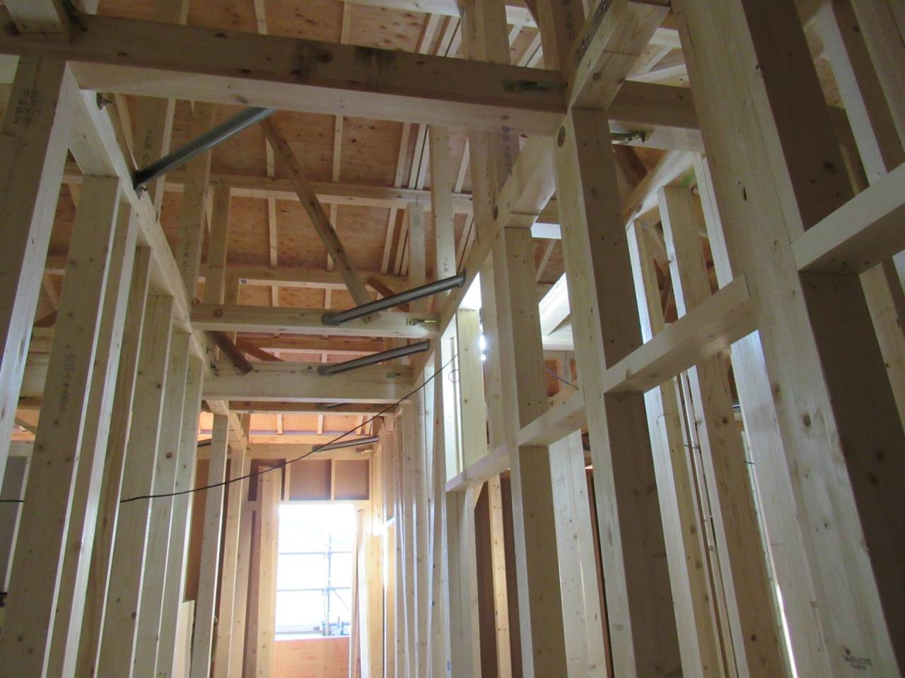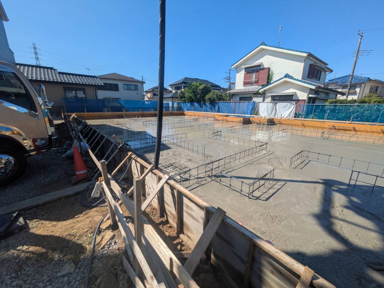みなみ風15新築工事 2026/03/06 残念ですが、外構工事中で内部をお見せ出来ません。 次回をお楽しみに。 外壁の工事もほぼ終わりました。 木工事も大分進んでいます。 断熱工事が完了しました。 建物の全容が分かるようになりました。 安全第一に工事を進めています。 中央にある飾りは幣串(へいぐし)と言い、新築の棟上げの儀式で、家屋の守護と家内安全を願って屋根裏の最も高い部分(棟木)に取り付けられる魔除けの飾りです。 構造をご覧ください。金具による補強もしています。 屋根の防水工事が終わりました。 上棟式を行いました。 建物の4隅を清めました。 完成の無事を祈って乾杯をしました。 関係者がそろって記念撮影です。 上棟しました。 野地板を貼り終えました。 垂木も貼り終えました。 木工事が始まりました。 基礎工事が終了しました。 基礎工事が始まりました。 配筋工事が終了しました。 地鎮祭が行われました。 神主様により四方を清めました。 鍬入れの儀です。 関係者全員がお祓いをして頂きました。 お神酒でお清めをしました。 地鎮祭も無事終わり、記念撮影です。 福祉施設・店舗建築