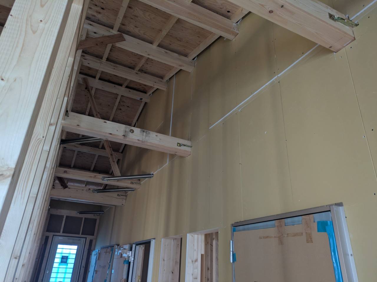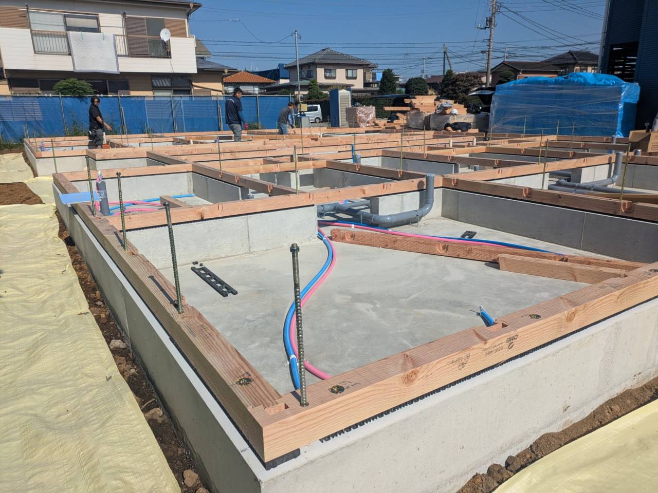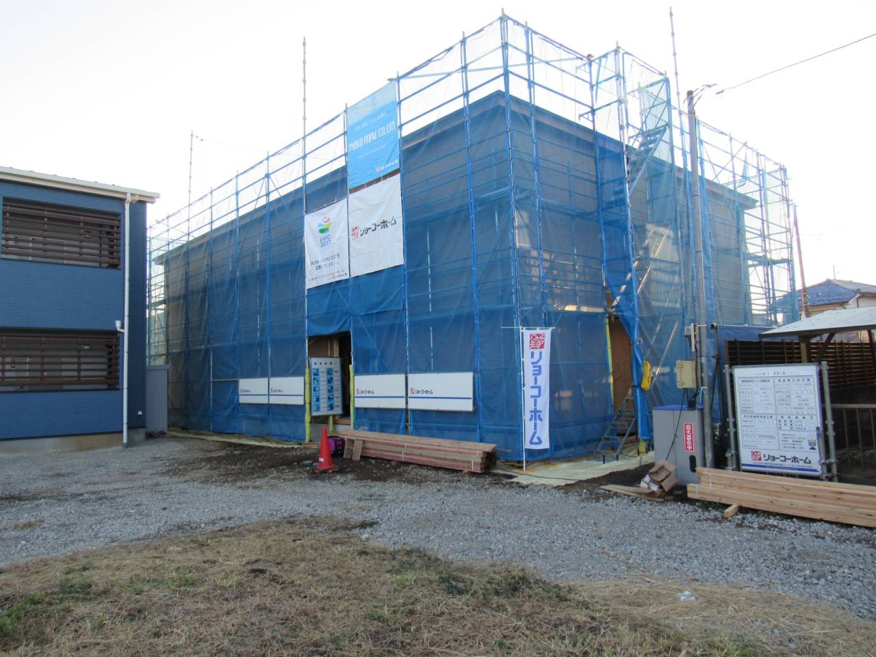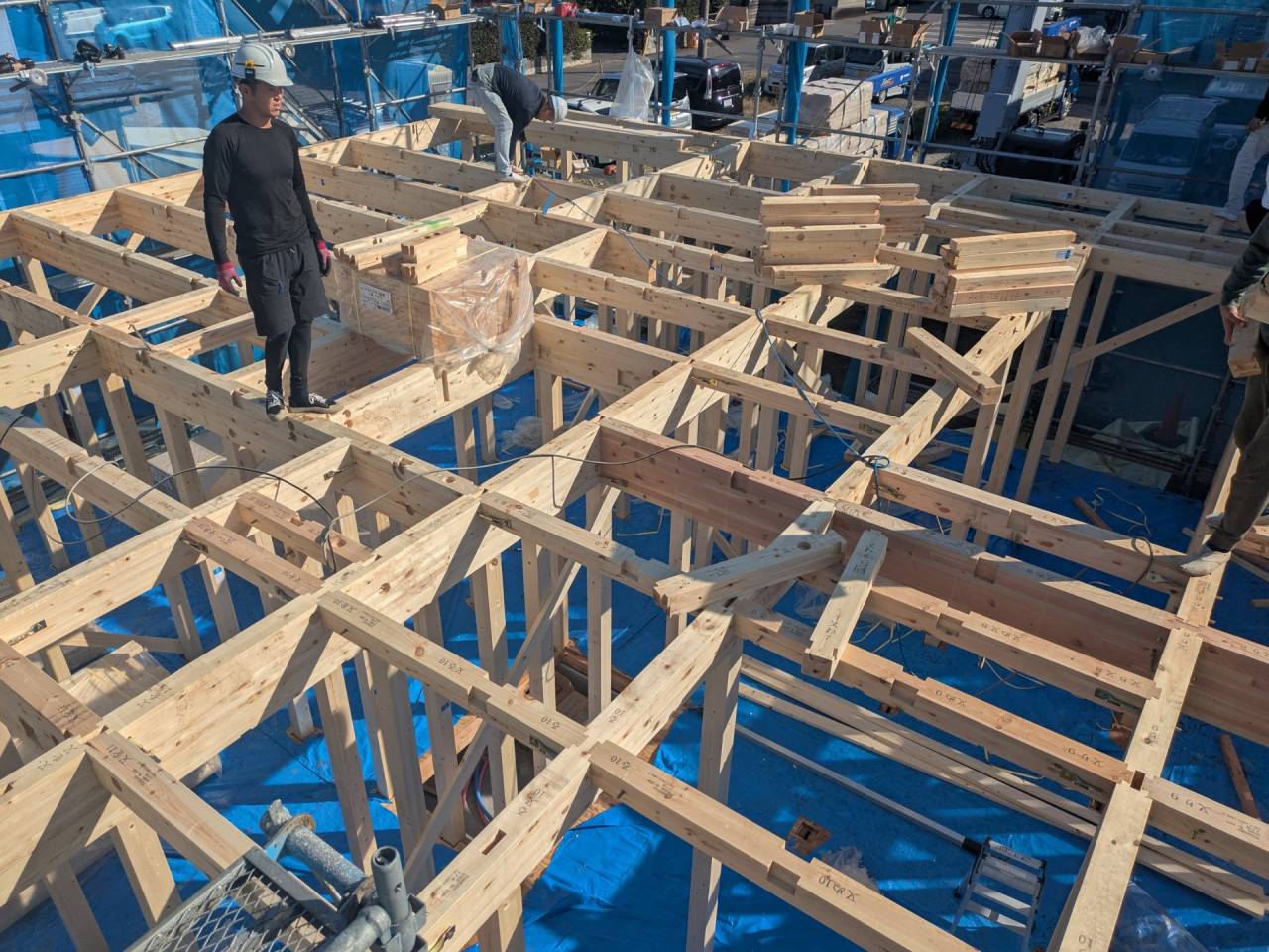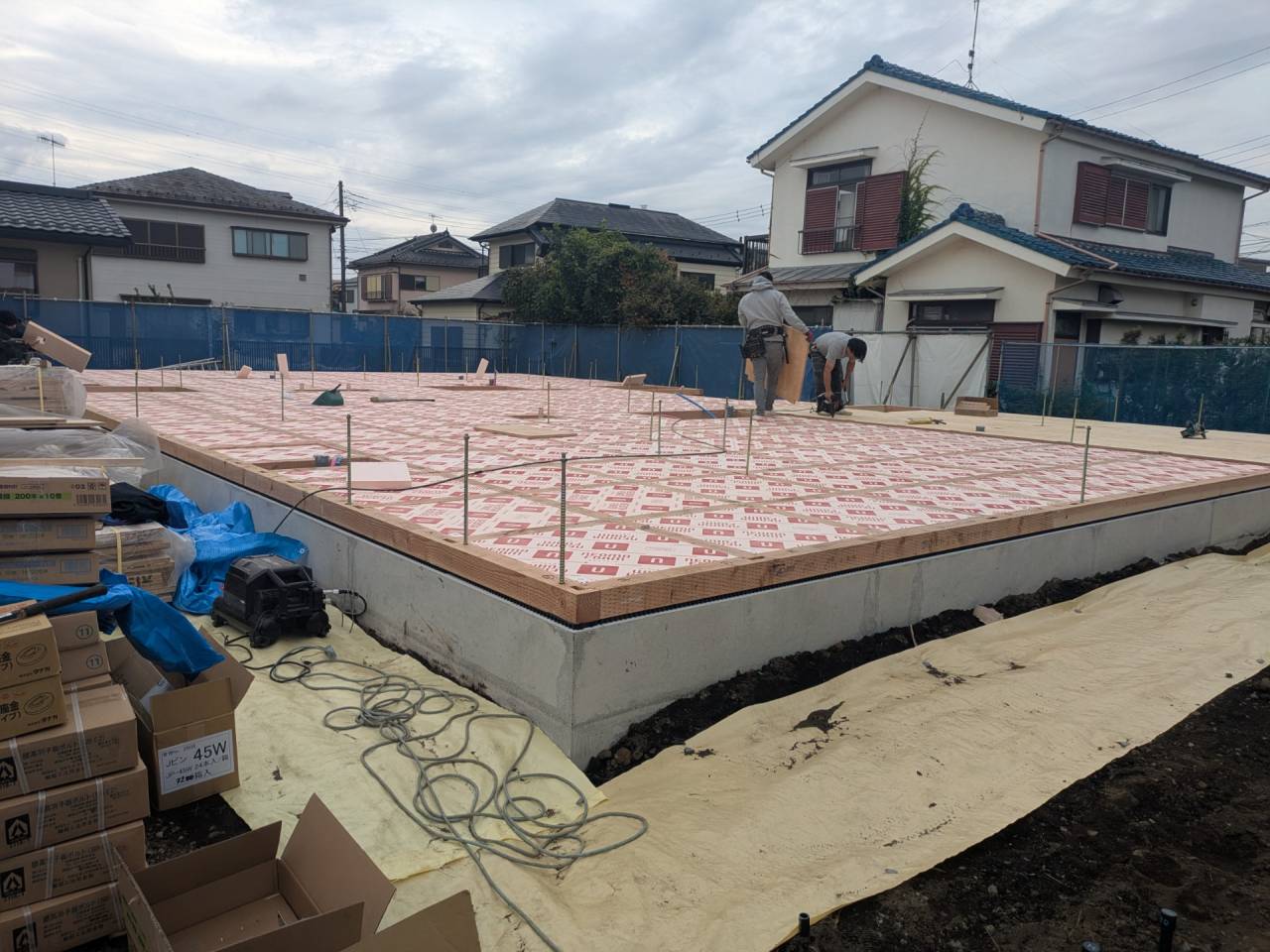みなみ風15新築工事 2026/03/06 残念ですが、外構工事中で内部をお見せ出来ません。 次回をお楽しみに。 外壁の工事もほぼ終わりました。 木工事も大分進んでいます。 断熱工事が完了しました。 建物の全容が分かるようになりました。 安全第一に工事を進めています。 中央にある飾りは幣串(へいぐし)と言い、新築の棟上げの儀式で、家屋の守護と家内安全を願って屋根裏の最も高い部分(棟木)に取り付けられる魔除けの飾りです。 構造をご覧ください。金具による補強もしています。 屋根の防水工事が終わりました。 上棟式を行いました。 建物の4隅を清めました。 完成の無事を祈って乾杯をしました。 関係者がそろって記念撮影です。 上棟しました。 野地板を貼り終えました。 垂木も貼り終えました。 木工事が始まりました。 基礎工事が終了しました。 基礎工事が始まりました。 配筋工事が終了しました。 地鎮祭が行われました。 神主様により四方を清めました。 鍬入れの儀です。 関係者全員がお祓いをして頂きました。 お神酒でお清めをしました。 地鎮祭も無事終わり、記念撮影です。 福祉施設・店舗建築