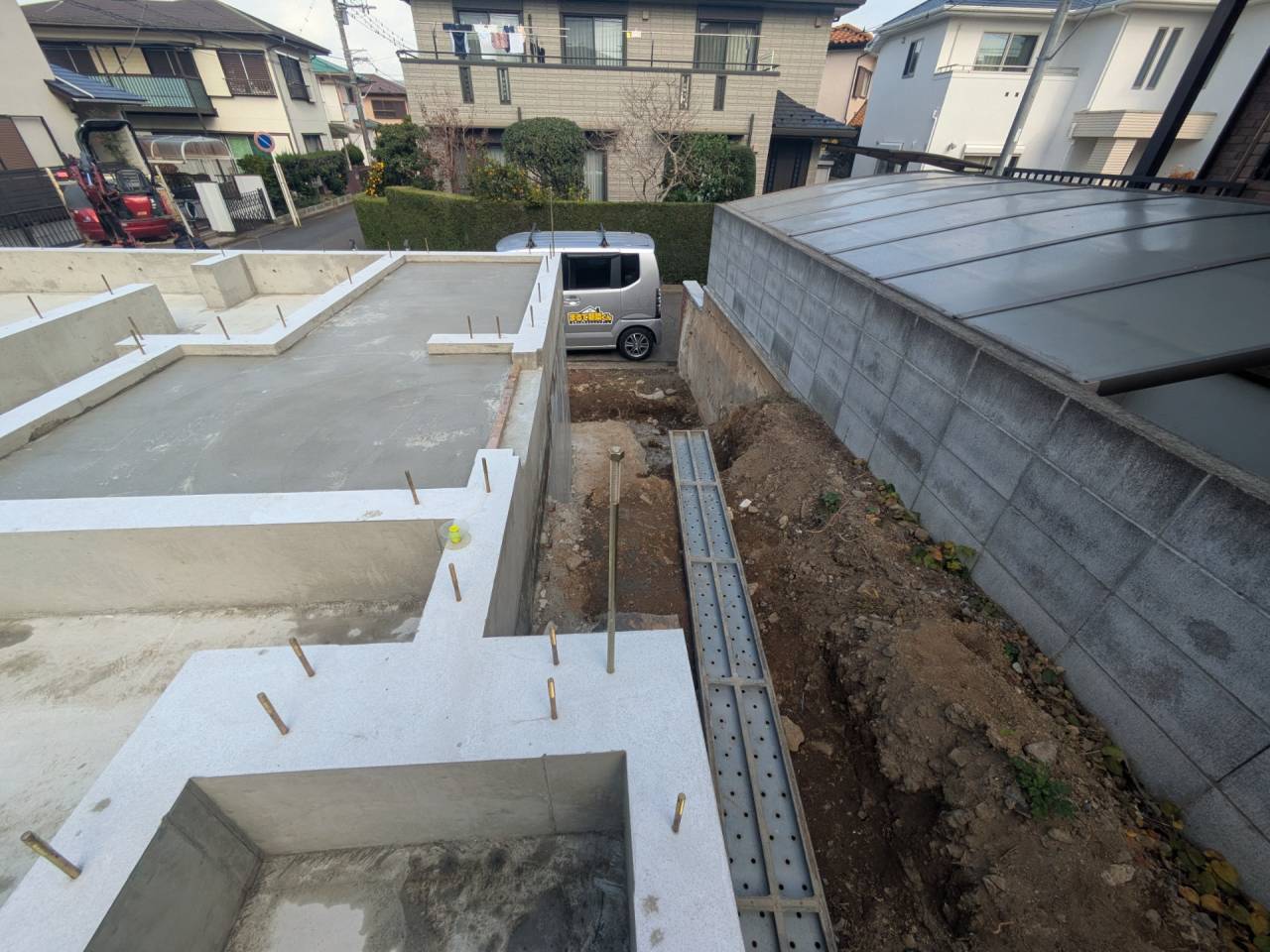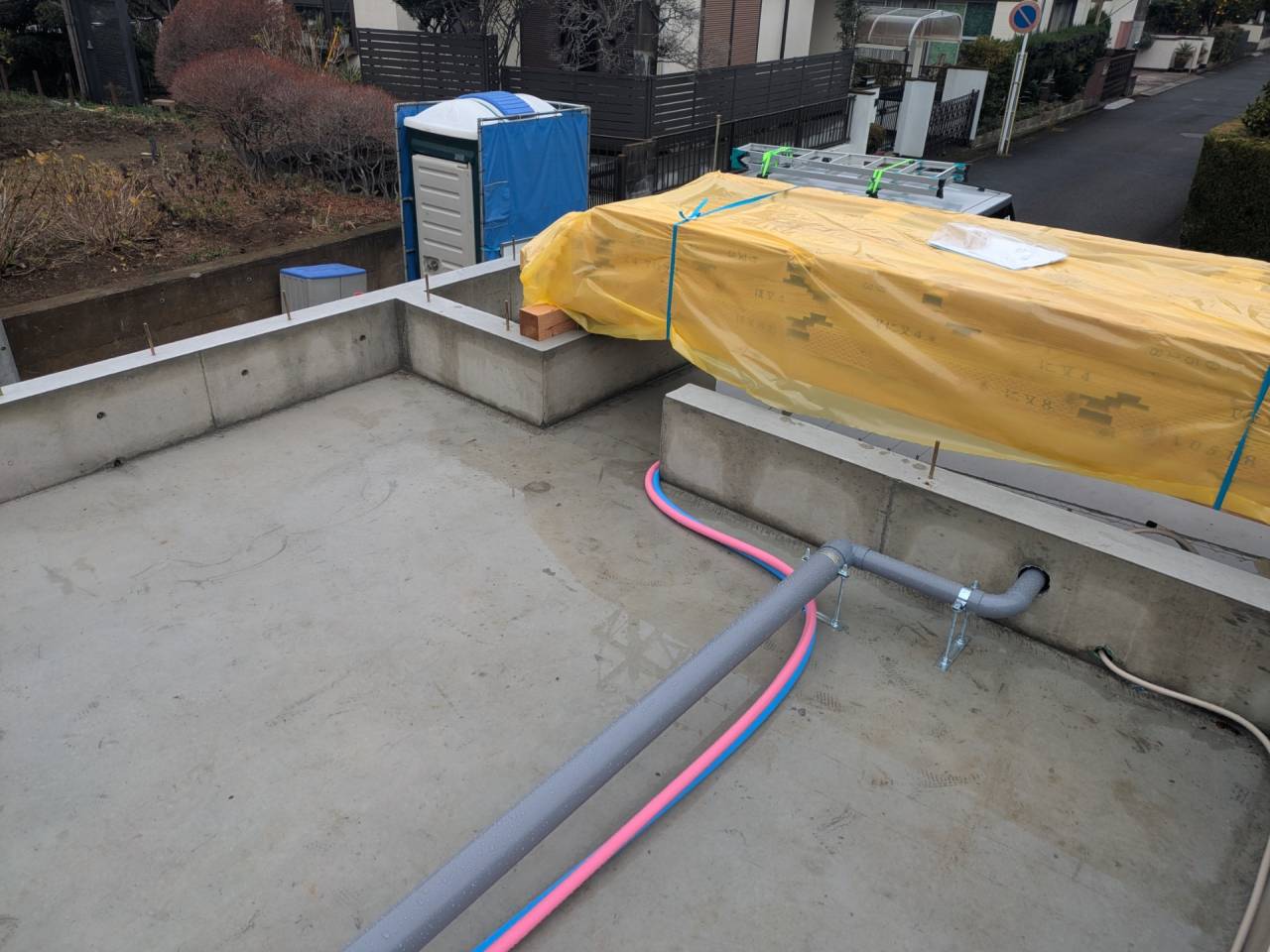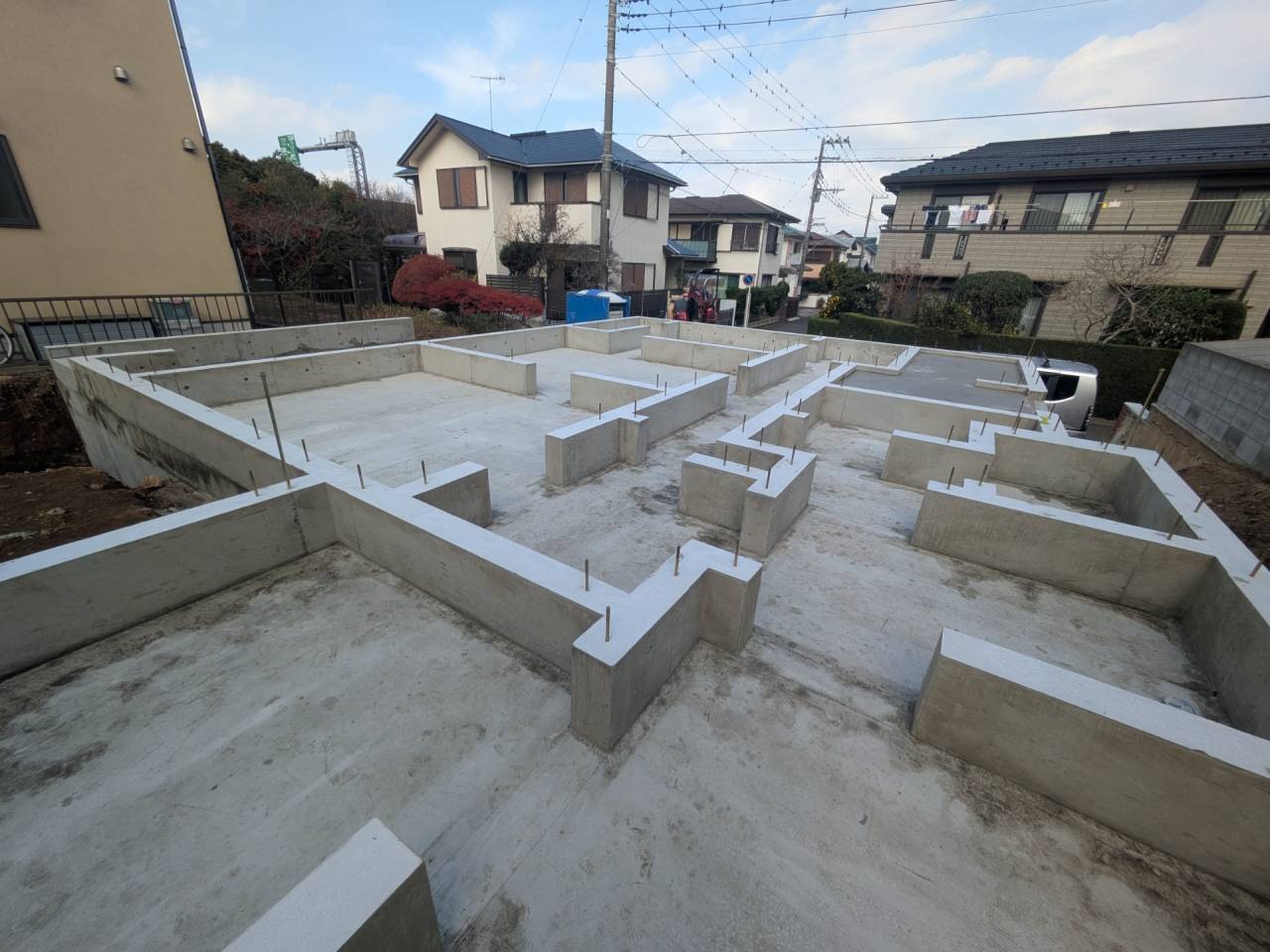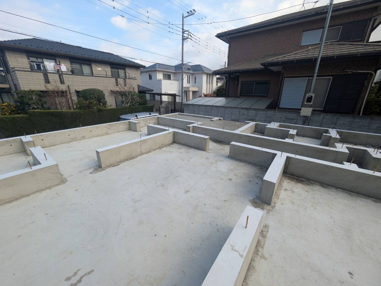 I様邸新築工事 2026/01/30 外壁の防水も完了です。 上棟しました。 屋根も無事完成しました。 仮囲いが出来ました。 材料が搬入されました。 木工事が始まりました。 床下配管が整いました。 基礎工事が完了しました。 基礎改良工事を行っています。 かなり大規模な工事です。 新築住宅