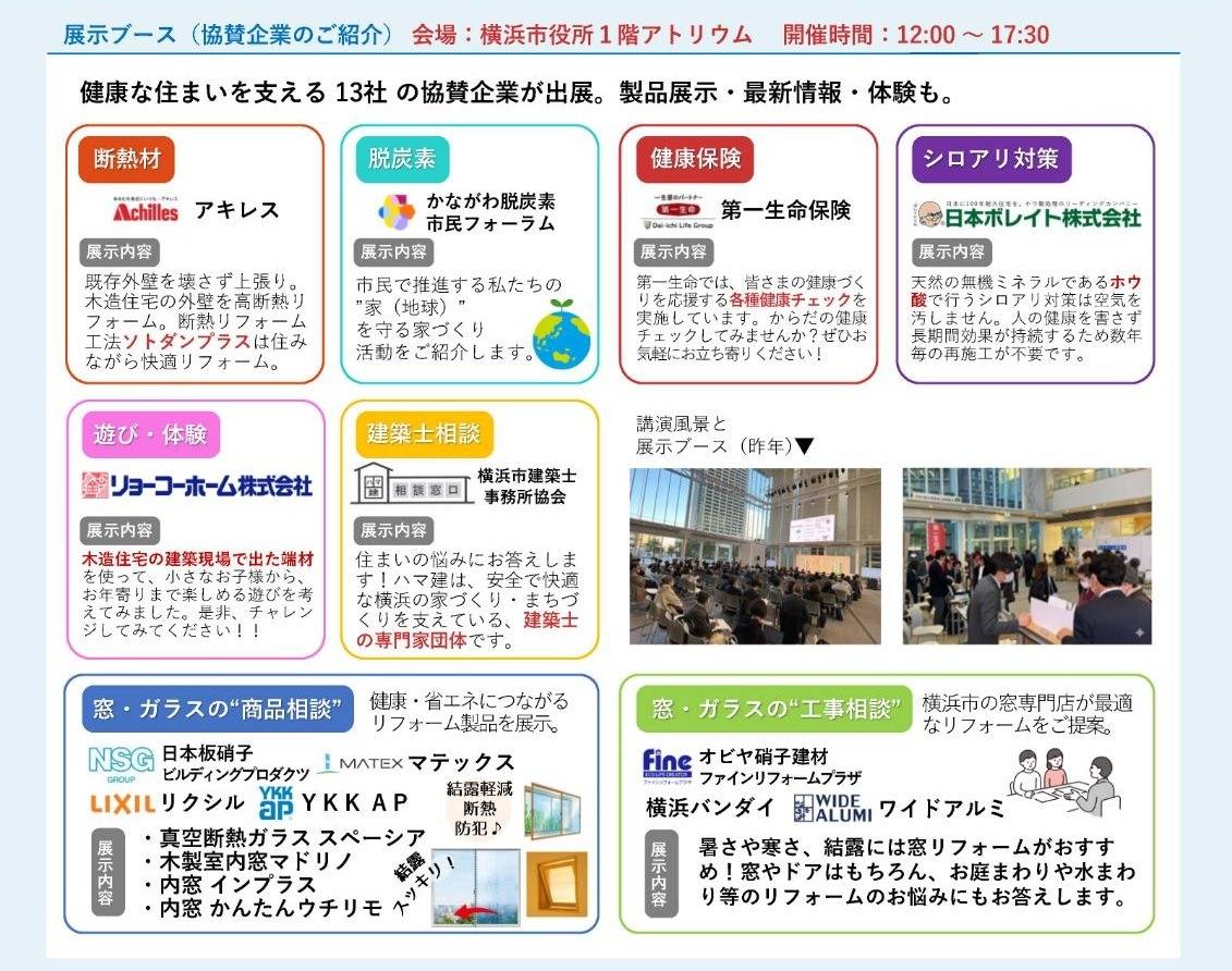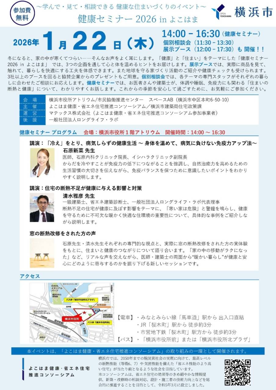 2026年1月22日(木)横浜市役所1階アトリウムに『遊び・体験』ブースを出展 2026/01/23 『健康セミナー 2026 IN よこはま』の開催に共催しブースに出店しました。 『冷え』を取り健康に暮らすをテーマに講演会が開かれました。 出展ブースには断熱窓の業者などが出店しました。 石原先生は冷えを取り健康に暮らすため次の4つを実行すると良いとのことでした。 1.毎日運動をする。スクワット(30回)、片足立ち(片足1分)、速足インターバル(3分ごと交互に) 2.入浴をヒートショックに気を付けてする。(41度位に10分) 3.腹巻を付ける。(24時間365日) 4.生姜を摂る。(特に、蒸生姜を1日10グラム) これで健康間違いなし。尚、部屋(家)の温度も 20℃位に保っておくのが良いそうです。 夜間寝室の温度が低いと、呼吸で内蔵の温度が下がってしまうそうです。 断熱のお住まいのご相談はリョーコーホーム迄! 学んで・見て・相談できる 健康な住まいづくりのイベント 健康セミナー2026 in よこはまに協賛出店します 開催時間:12:00~17:30 木造住宅の建築現場で出た端材を使って、小さなお子様からお年寄りまで楽しめる遊びを考えてみました。 是非、チャレンジしてみてください。 トピックス イベント情報 I LOVE 泉区