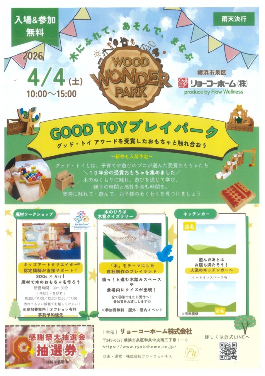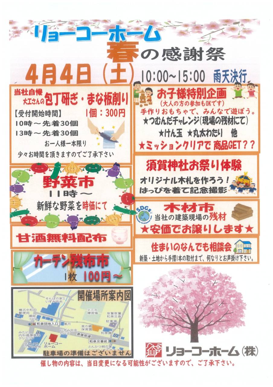 4月4日(土)リョーコーホーム春の感謝祭 開催 2026/02/27 今年も包丁研ぎや野菜市を開催します 住まいのなんでも相談会も開催します お気軽にお声掛け下さい 同時開催で木に触れて、遊んで、学ぶ 【ウッド・ワンダー・パーク】開催 トピックス イベント情報 I LOVE 泉区