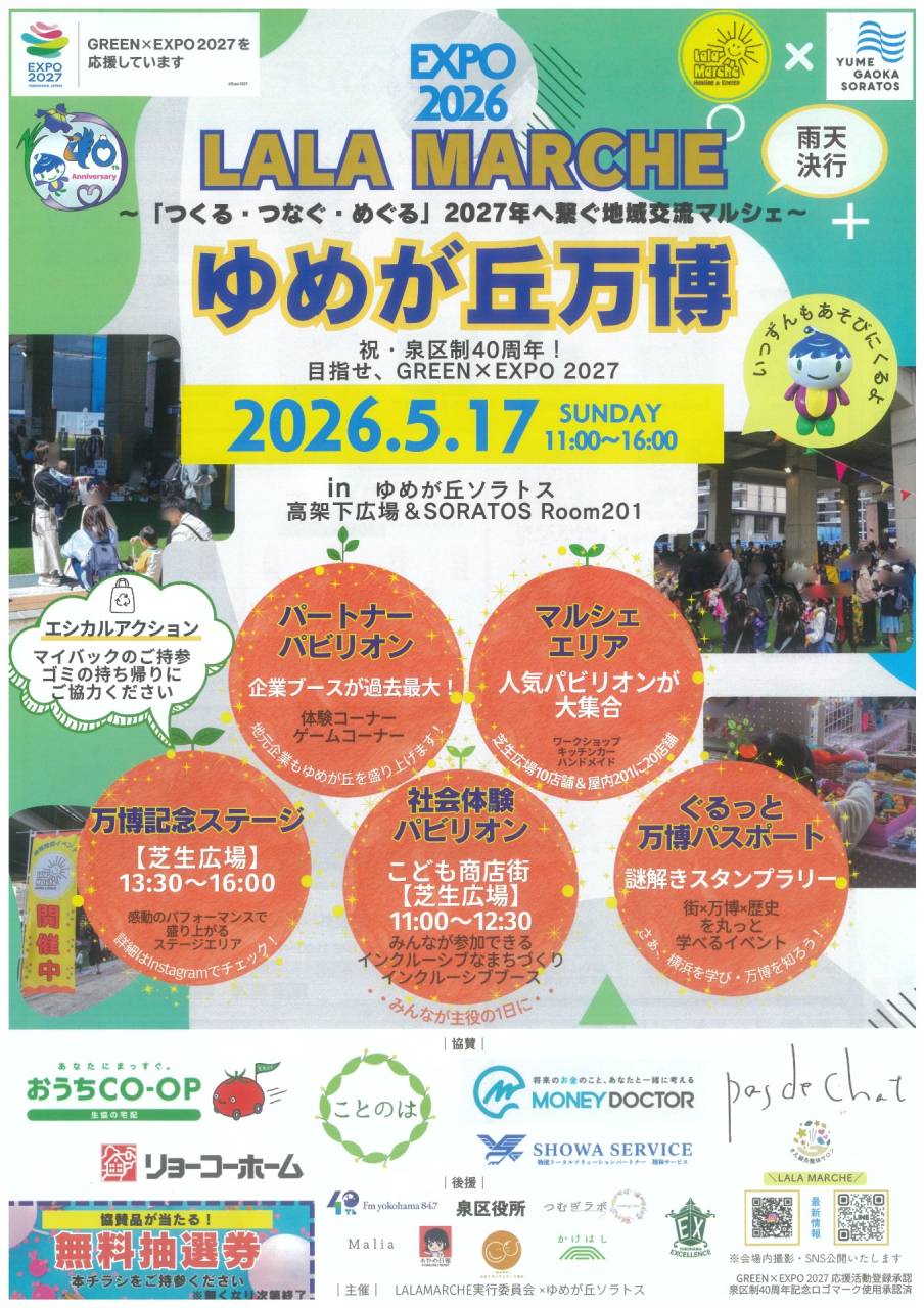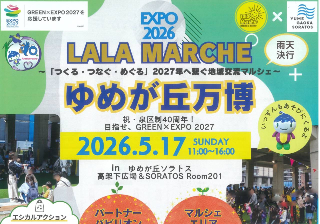 LALA MARCHE 夢が丘万博に協賛 2026/04/24 2026/5・17(日) 11:00~16:00 パートナーパビリオンに体験コーナーを開設 木に触れて遊んでください トピックス イベント情報 I LOVE 泉区